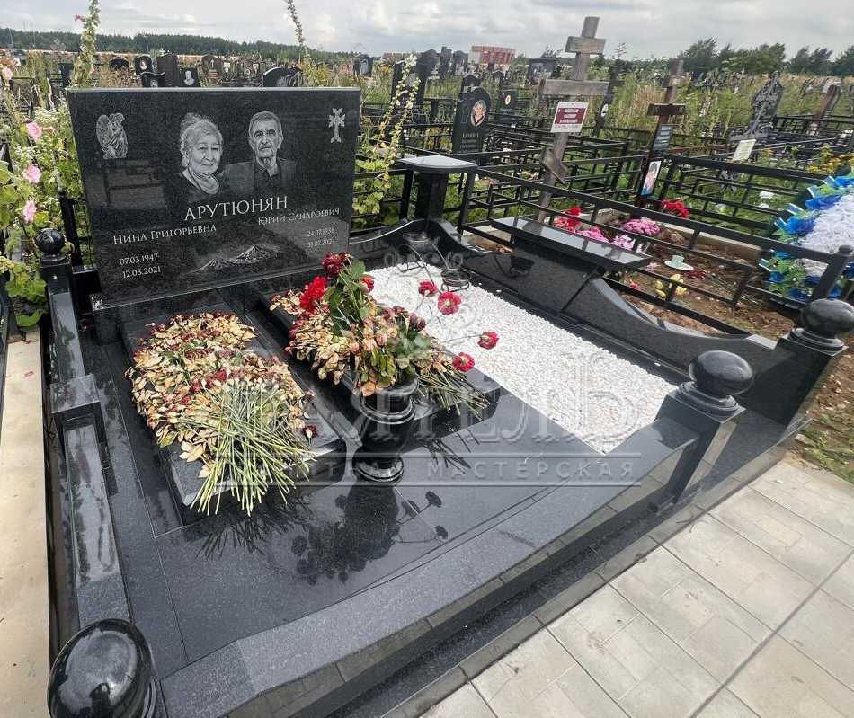 Армянский памятник №АП-17 на две могилы для семейного захоронения. Горизонтальная стела из черного гранита, на которой выгравированы портреты и памятные надписи.