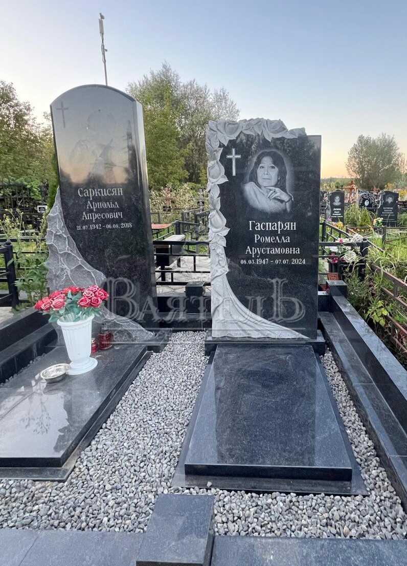 Вертикальная стела из черного гранита. Резьба по камню – растительный орнамент. Подставка и надгробная плита.