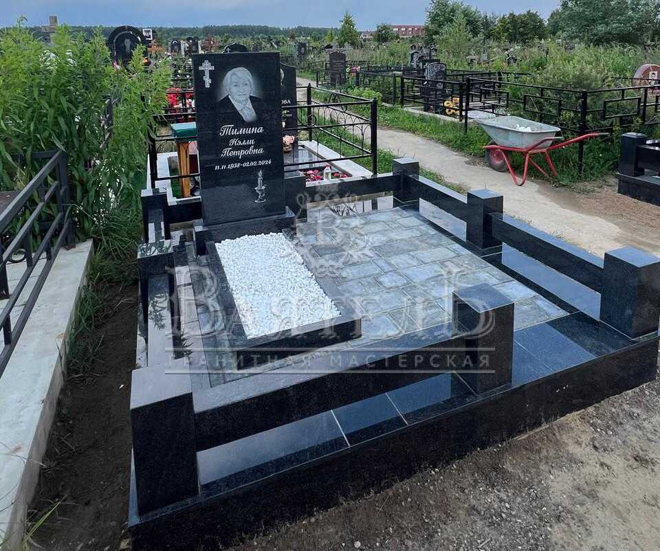 Вертикальная стела из черного гранита. Комплексное оформление: гравировка портрета и памятных надписей, подставка, цветник, ограда, пол.