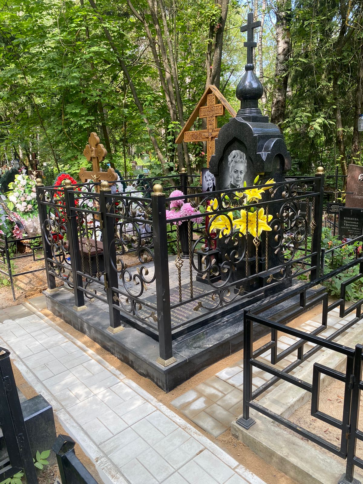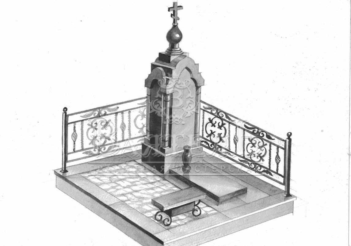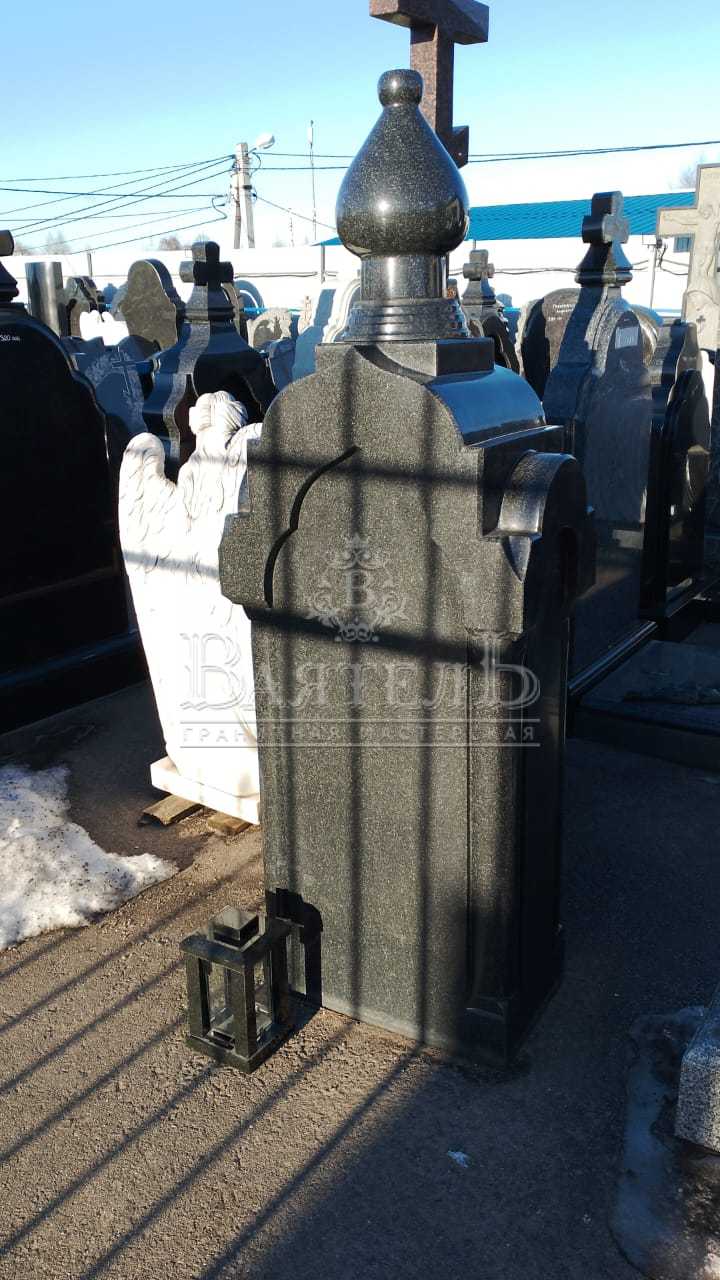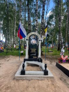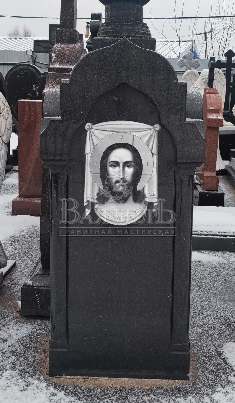 Основной элемент – памятник в виде часовни из черного гранита Габбро-Диабаз. На лицевой стороне — высоко детализированный VIP-портрет, а на обратной— икона Спасителя. Надписи на памятнике и надгробной плите покрыты сусальным золотом.