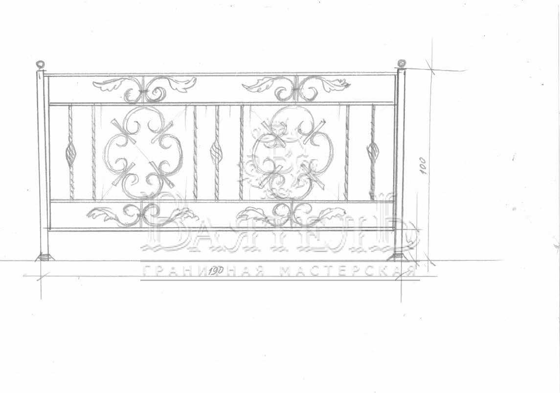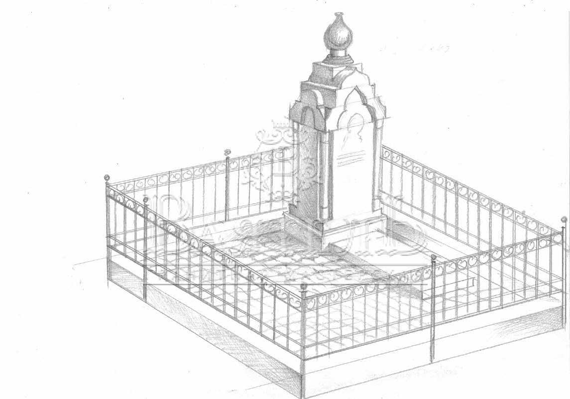 Участок вымощен брусчаткой и гранитной плиткой, дополнен металлической скамейкой с ящиком и деревянным сиденьем. Территорию окружает фигурная металлическая ограда (высота 110 см), окрашенная в черный цвет с позолоченными элементами.