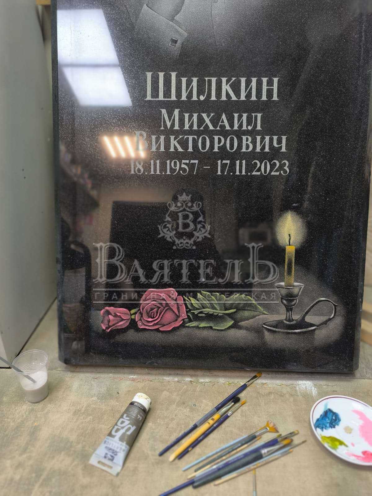 - Семен Щербюк добавил художественный акцент в виде цветных роз со свечой, которые выделяются на фоне черного камня.