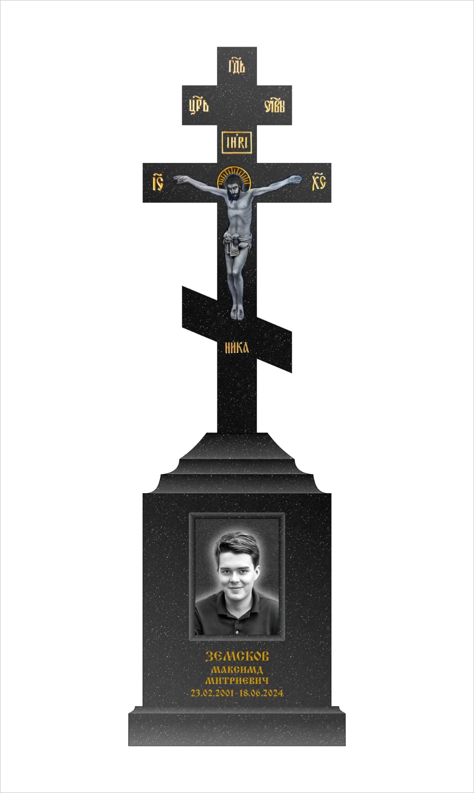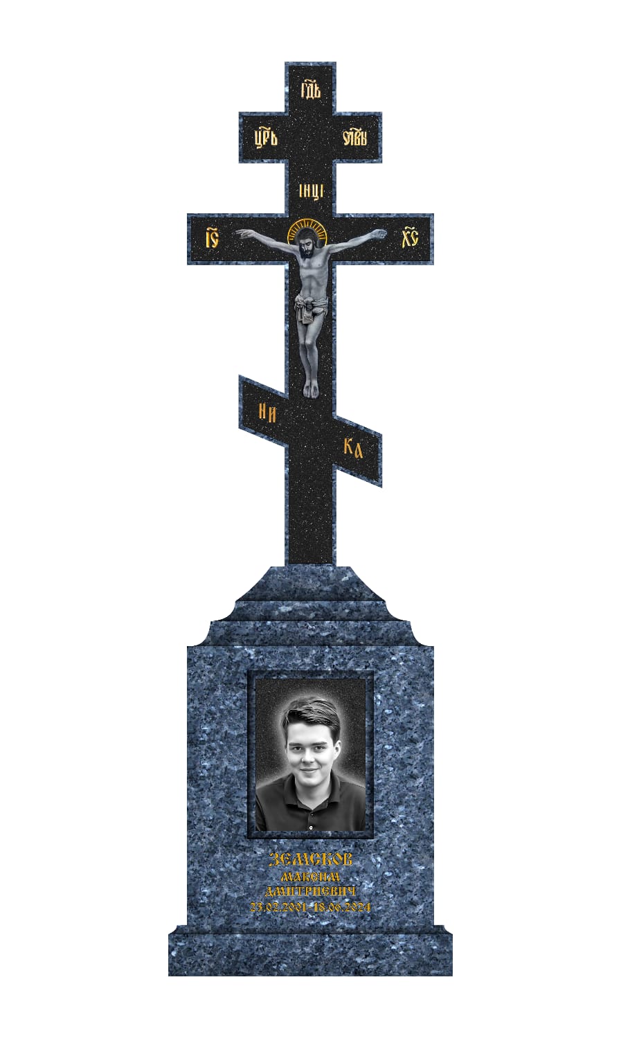 Текст: Надписи — имя, даты, и символика на кресте —вырублены в глубь камня и покрыты белым сусальным золотом.