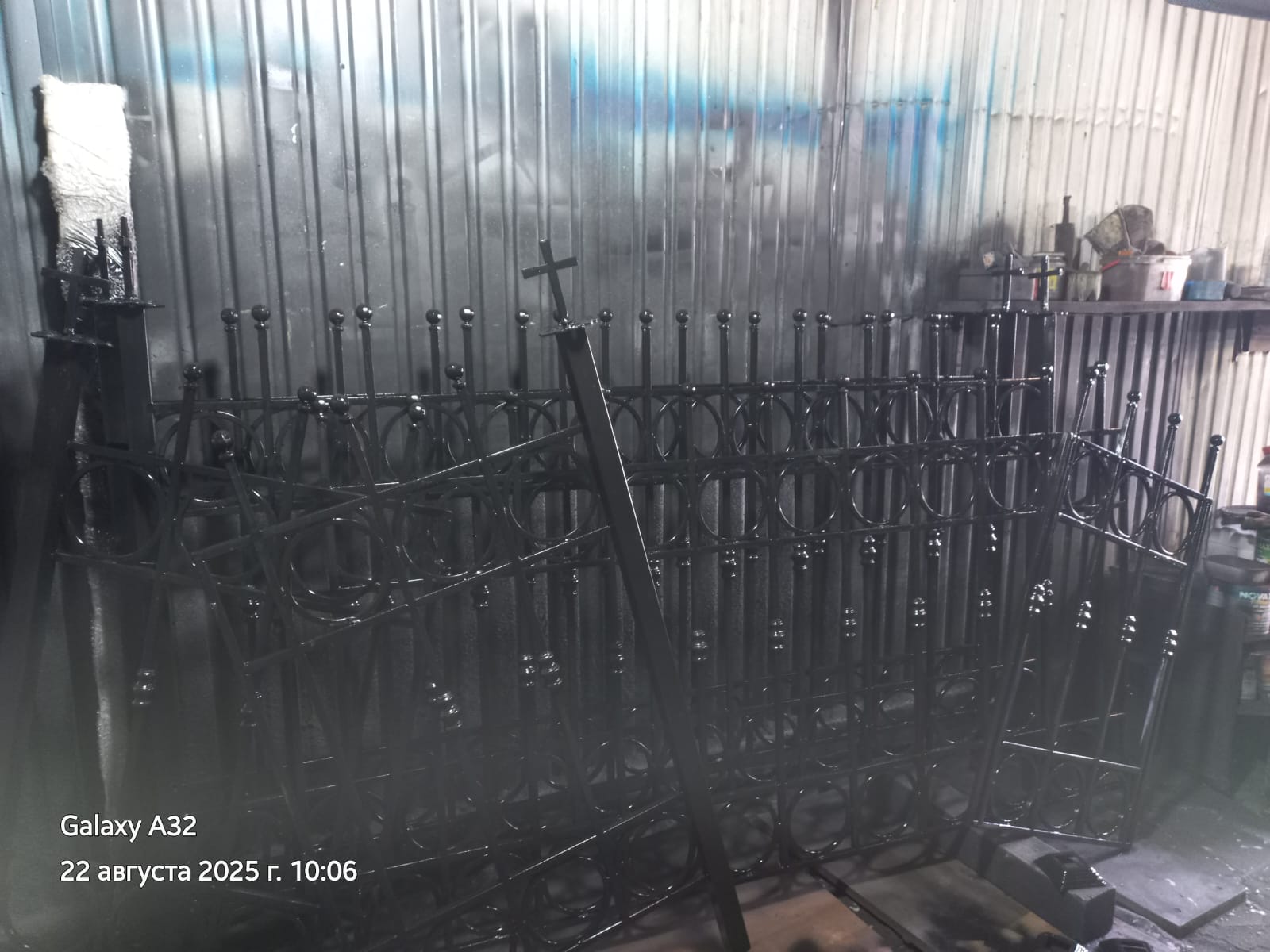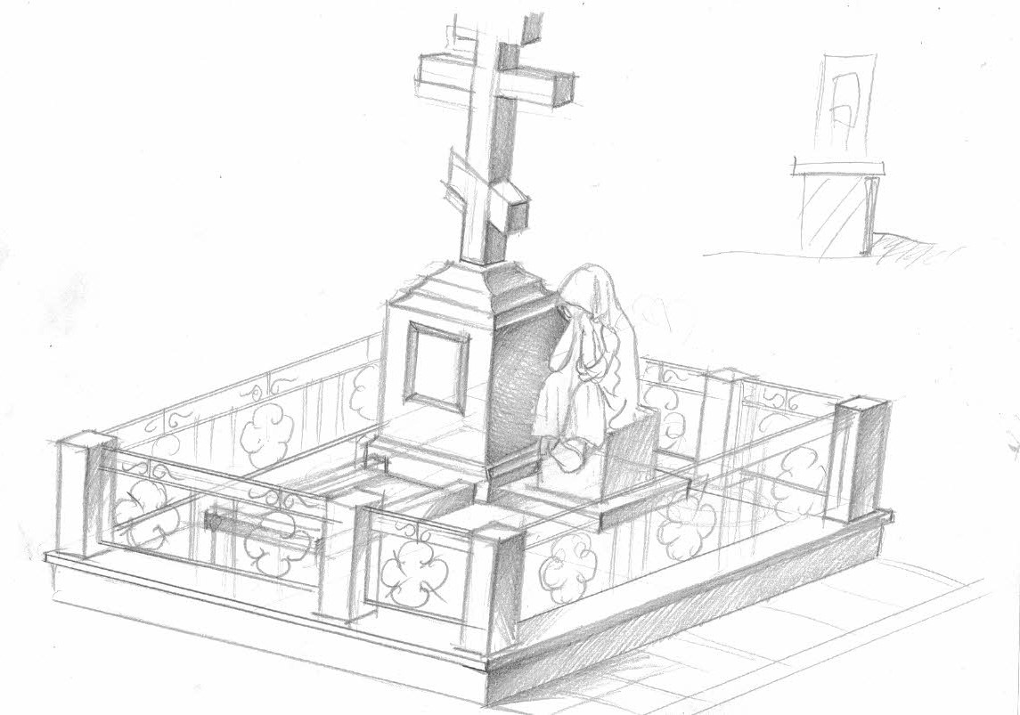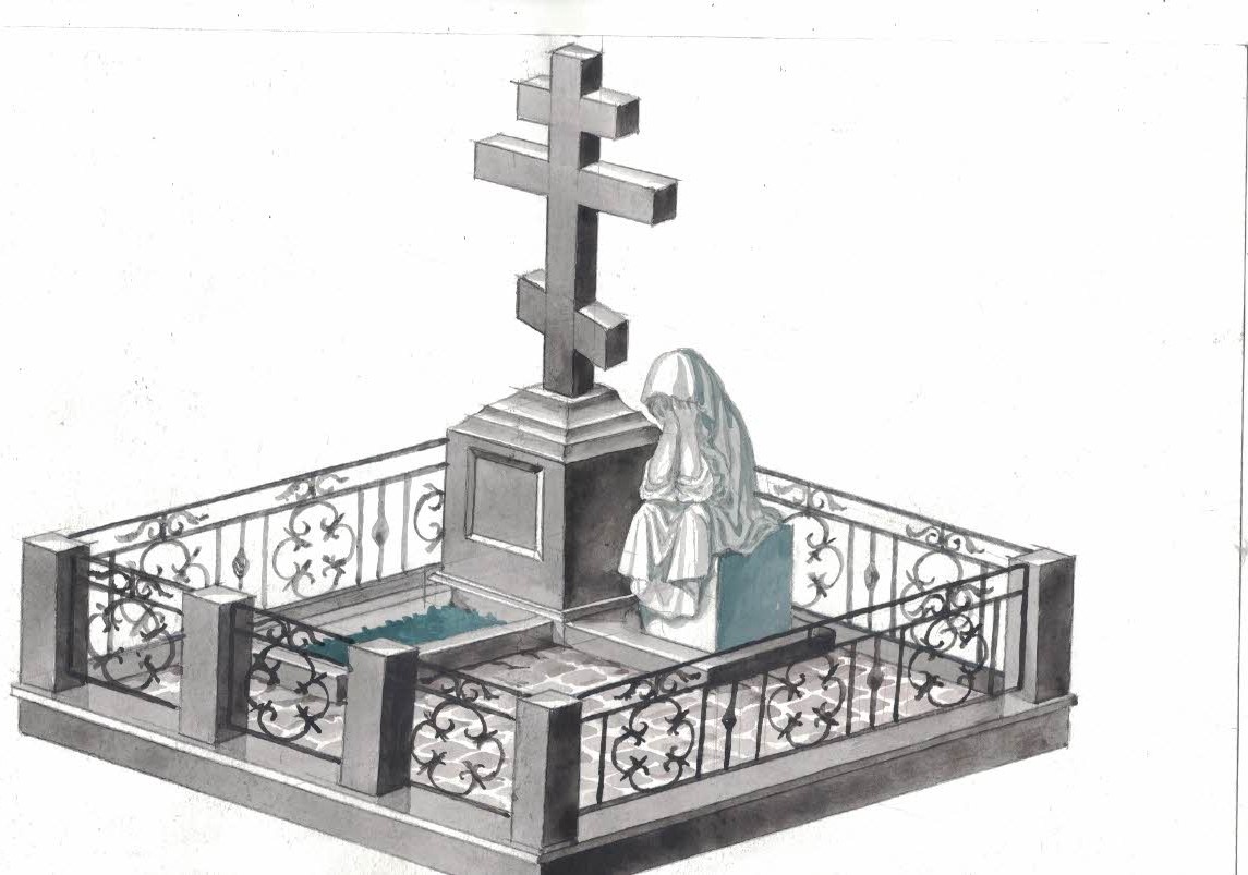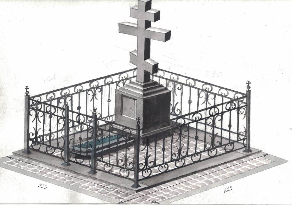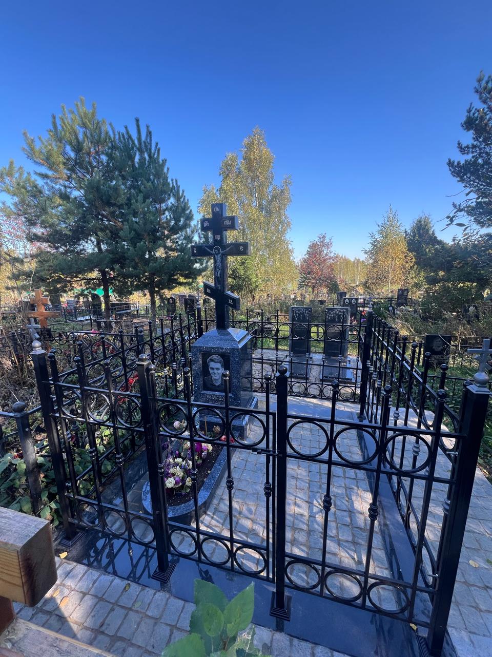 В композицию включен крест, изготовленный из Blue Pearl с контрастной вставкой из черного Габбро-Диабаза, что эстетически связывает его с цоколем. Комплекс огорожен изящной кованой оградой, созданной по индивидуальному проекту.
