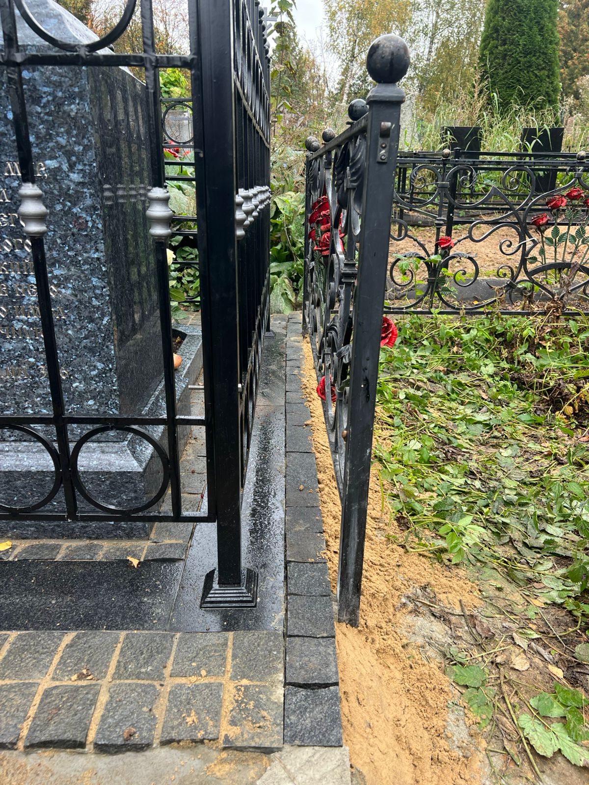 Участок обрамлен гранитным цоколем из Габбро-Диабаза. Вся внутренняя и прилегающая территория вымощена колотой брусчаткой. Такое мощение обеспечивает чистый, законченный вид комплекса и упрощает уход за местом захоронения.