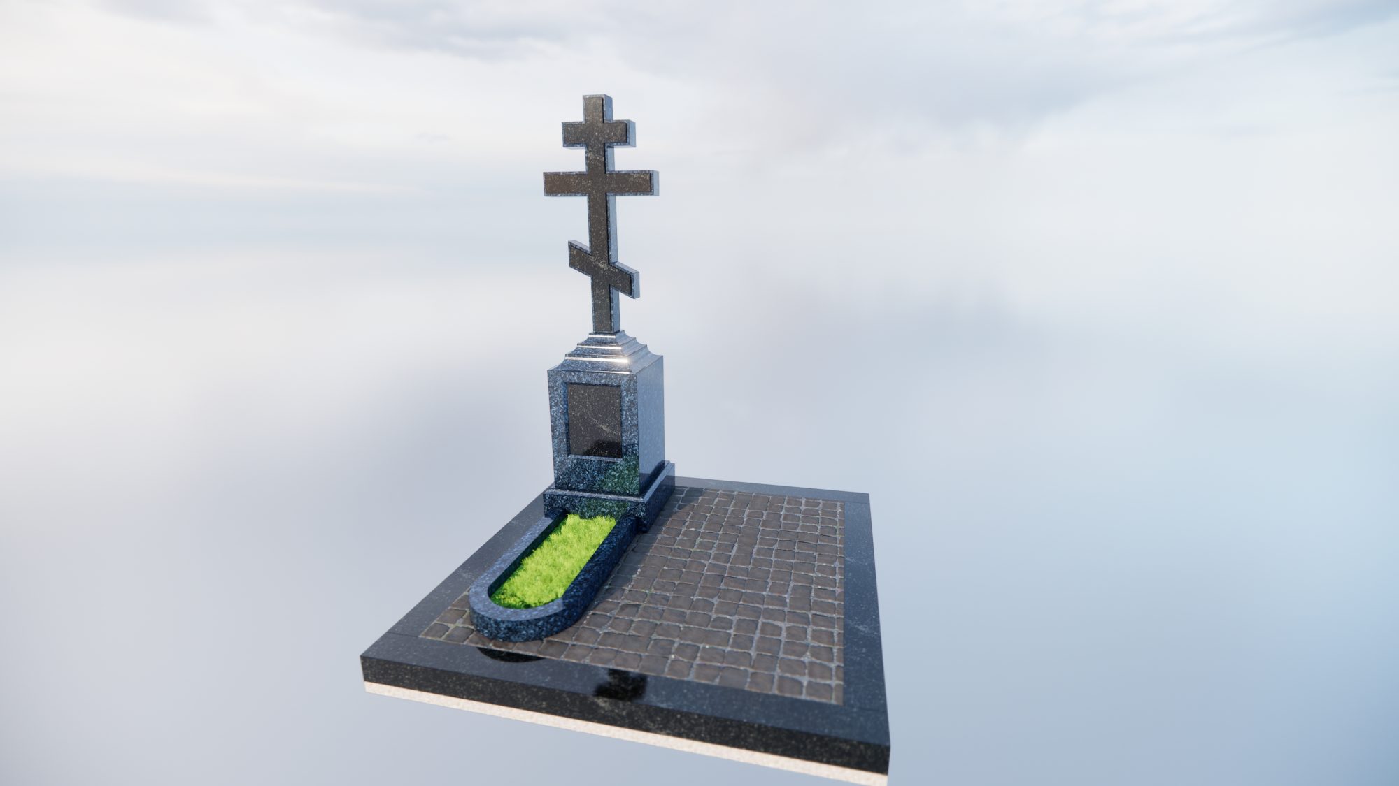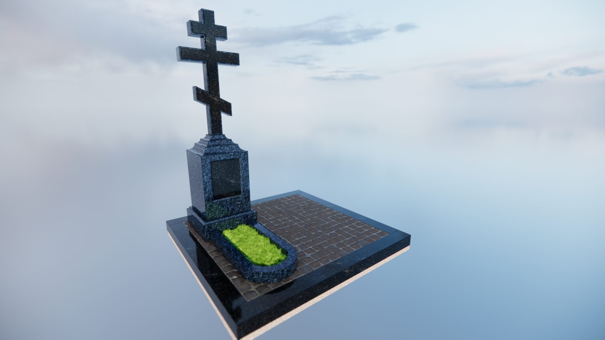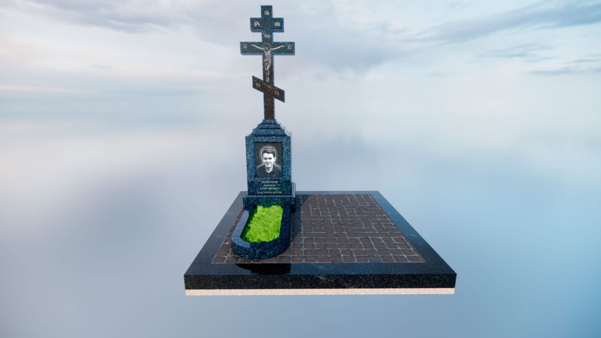 Центральная стела выполнена из цельного блока Норвежского гранита Blue Pearl. Этот камень отличается уникальным глубоким синим фоном с выраженными перламутровыми вкраплениями.
