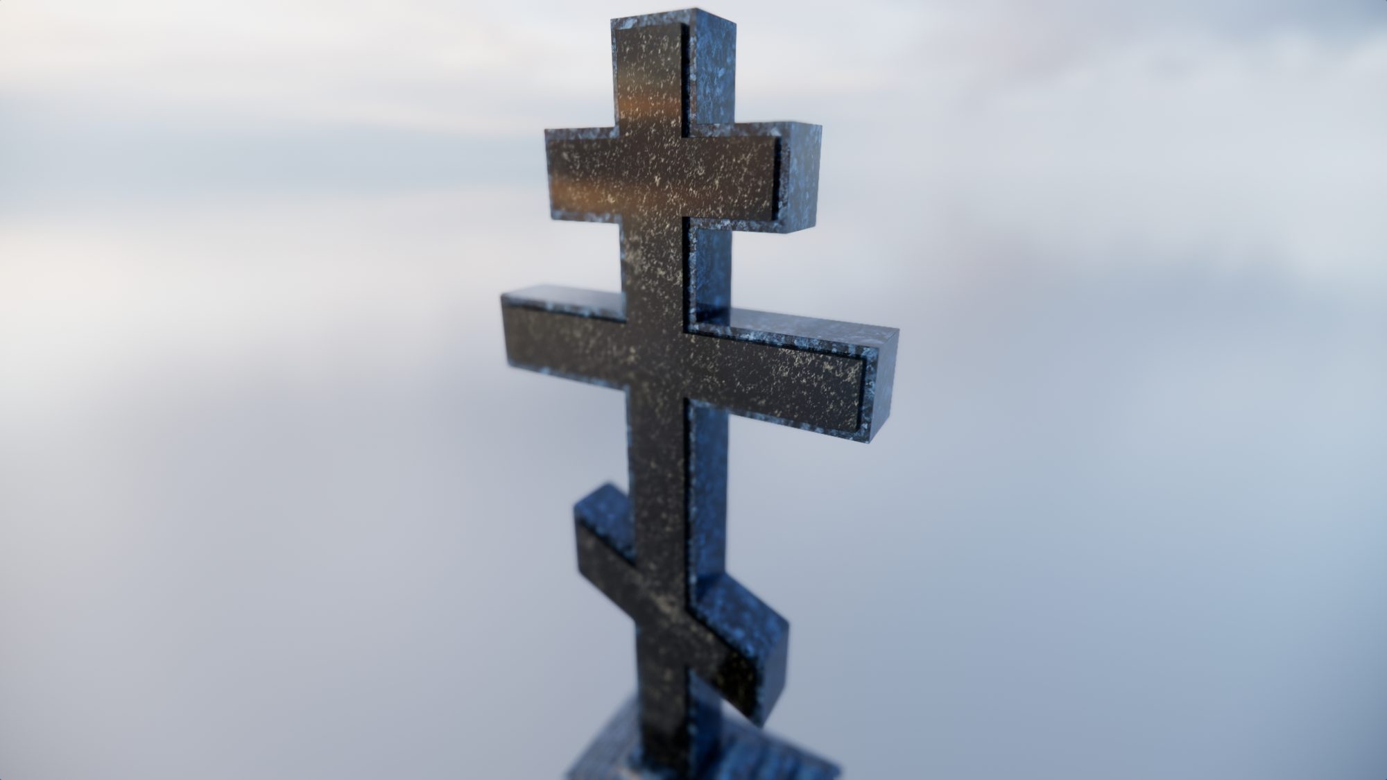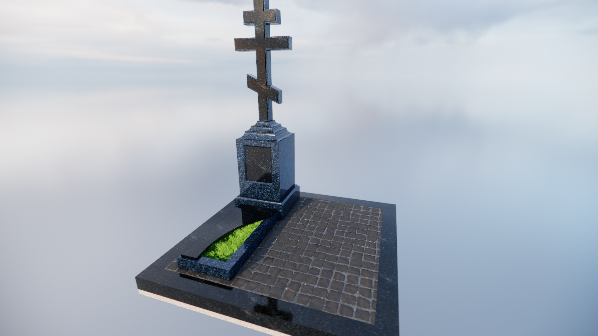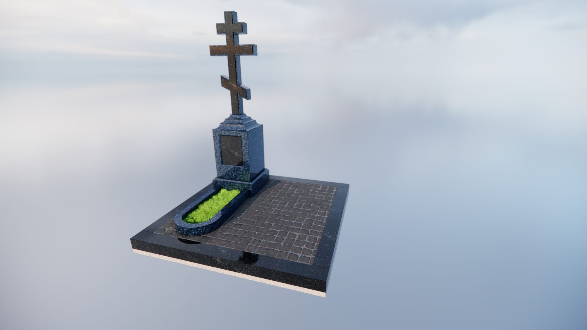 Центральная стела выполнена из цельного блока Норвежского гранита Blue Pearl. Этот камень отличается уникальным глубоким синим фоном с выраженными перламутровыми вкраплениями.