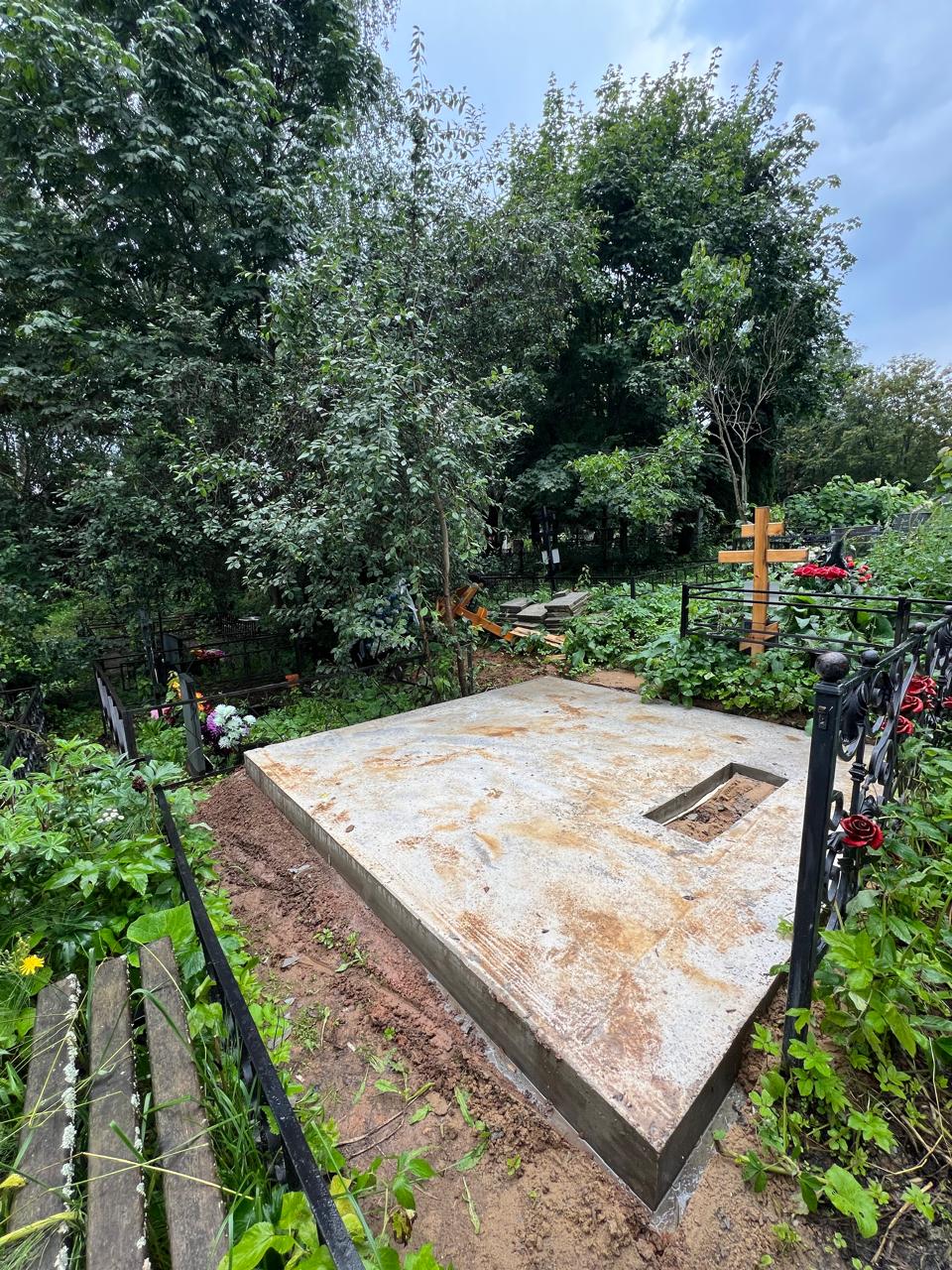 Основой комплекса служит прочная бетонная плита. При заливке были учтены практические детали: оставлен технологический «мост» для сохранения места под возможное второе захоронение, а также предусмотрена зона для цветочной клумбы.
